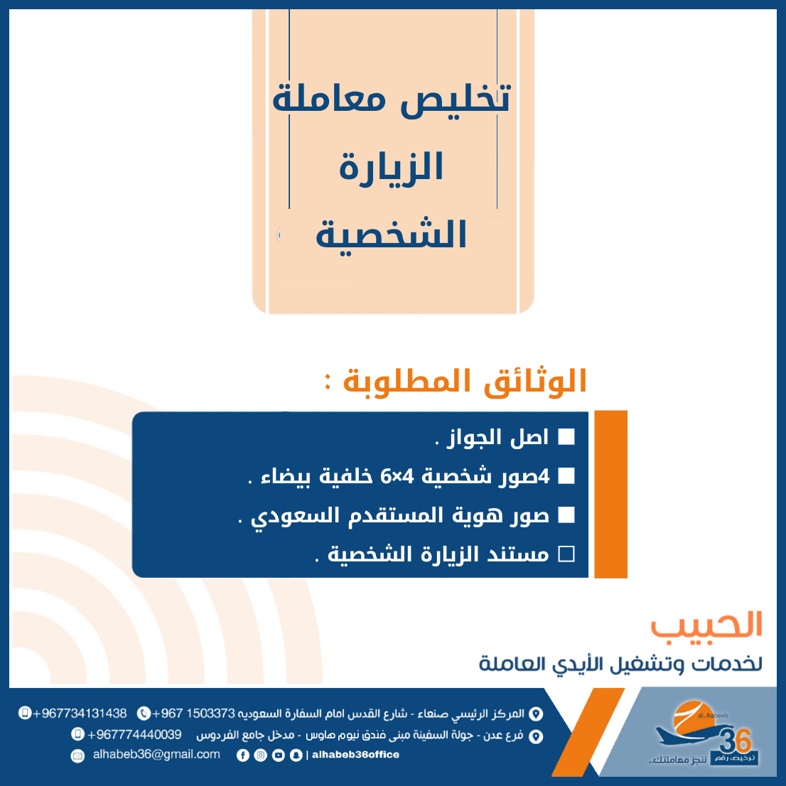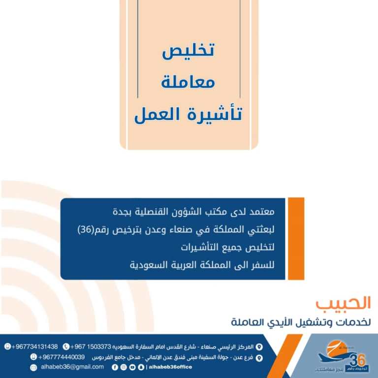 نعمل على تخليص معاملة تأشيرة فيز العمل حسب تعليمات السفارة السعودية بصنعاء وعدن للوثائق المطلوبة لتخليصها بتفويض مكتبنا بترخيص رقم (36)